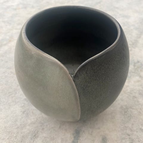 Unik keramik kop eller vase og skål med håndlavet finish og varierede farver i grønne og kobber nuancer. Begge dele er signeret i bunden.