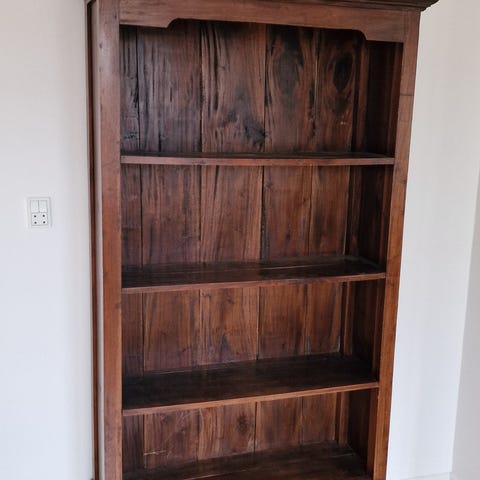 En spinkel reol i guldmalet træ. Måler forneden cirka 31,5 x 31,5 x 47 cm. Højde cirka 121,5 cm. Lidt shabby, men stabil.