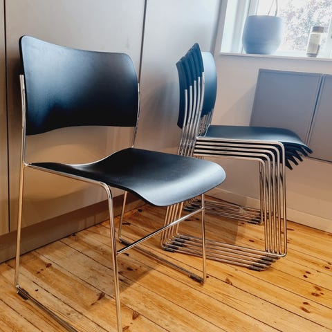 Stolen er designet af David Rowland. Er i sort træ med åre. Har været brugt som mødestol og har derfor lidt skrammer hist og pist. Har 6 stk. Nypris er kr. 2500 pr. stk. Sælges samlet for 3750 kr. eller 750 kr. pr. stk.