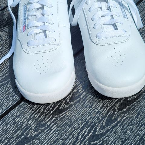 Reebok Classic Fitness Sko i størrelse 37. Skoene er designet til fitnessbrug og har en kombination af materialer med farver i hvid, grå, lyseblå og sorte detaljer.