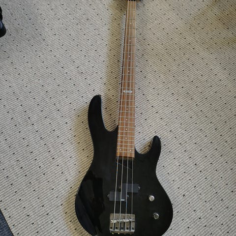 Sant Bass el-bas med sort og hvid finish. Instrumentet har en træhals og fire strenge. Designet til musikudøvere, der ønsker en klassisk el-bas til forskellige musikgenrer.