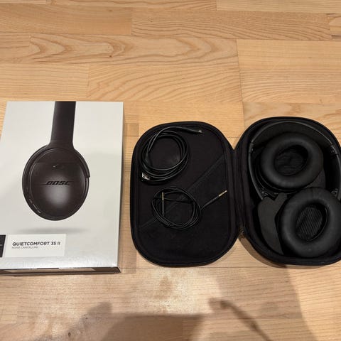 Bose QuietComfort 35 II trådløse hovedtelefoner i sort farve. Modellen har støjreduktionsteknologi (noice cancelling) og Bluetooth-forbindelse. Hovedtelefonerne er designet til komfortabel brug over længere tid og leveres med et beskyttende etui samt alt tilbehør. Købsbevis medfølger.