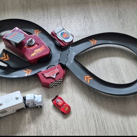 De tre biler har optræk og kører superhurtigt når man slipper dem. Den sammenklappelige kasse er god til at rydde op i. Den måler 28 x 28 x 28 cm.