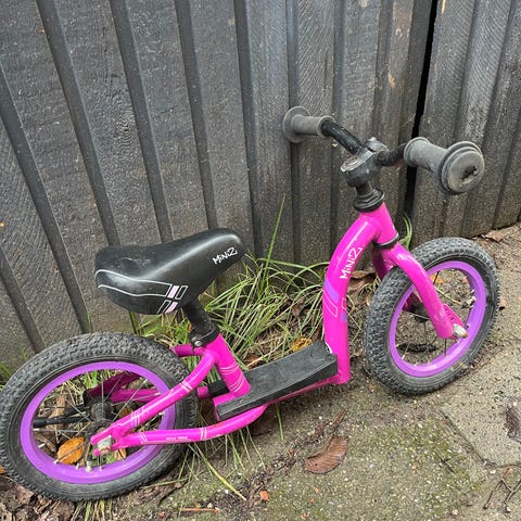 Volare Løbecykel til børn i blå og sølv farve. Cyklen har et børnevenligt design med komfortabelt sæde og robuste hjul, velegnet til små børn til at lære balance og cykling.