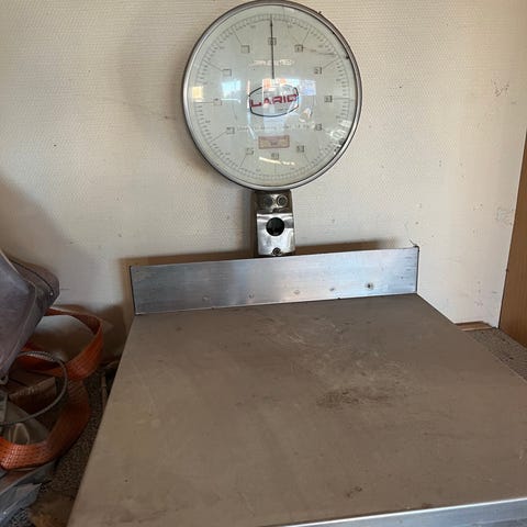 Rex SB 19 fra slagter med metalramme og vægtmåler. Velegnet til præcis vejning af genstande i hjemmet eller til kommerciel brug.