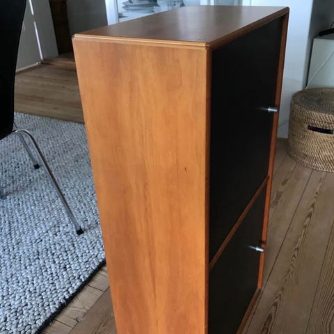 Skabshylderne har en del år bag sig. De er stadig i god stand. Glasset har ingen skræmmer. Det eneste der er værd at bemærke: Der er er rester efter hvid maling på kanten af det højre skab. Se de sidste billeder for eksempler. Der er blevet forsøgt malet rundt om skabet.