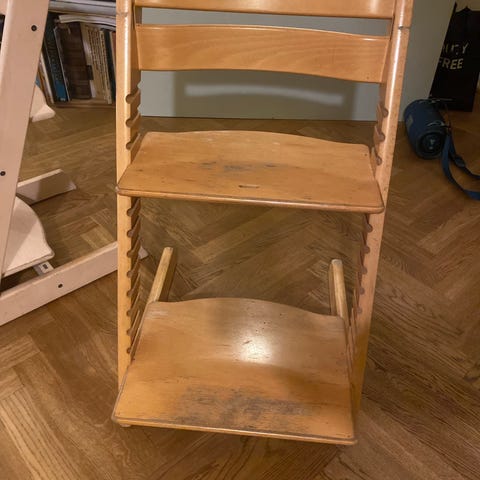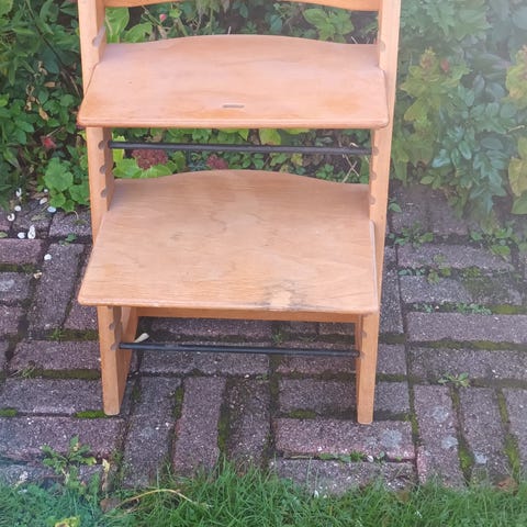 Stokke Højstol i træ. Højstolen er designet til børn og har justerbare trin og sæde, hvilket giver mulighed for tilpasning efter barnets størrelse. Stolens materiale er træ, og den har en robust konstruktion til brug i hjemmet.