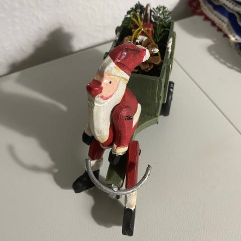 &Tradition Julepynt Julemand på cykel, egnet til jul. Dekorationen forestiller en julemand iført traditionelt rødt tøj med sort bælte og hvidt skæg, siddende på en cykel. Kan anvendes som juledekoration i hjemmet eller til festlige arrangementer i juletiden. Jule nisser sælges 40kr pr stk