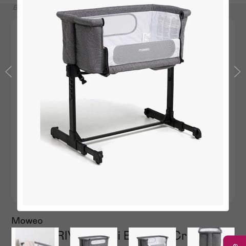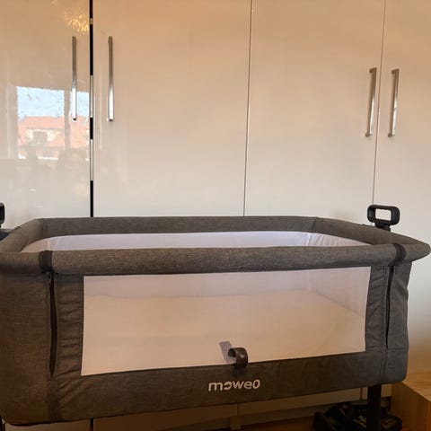 Moweo bedside crib designed for convenient placement next to an adult bed. Constructed with a sturdy frame and breathable mesh sides for visibility and airflow. Suitable for infants, providing a safe sleeping environment within close reach of parents.