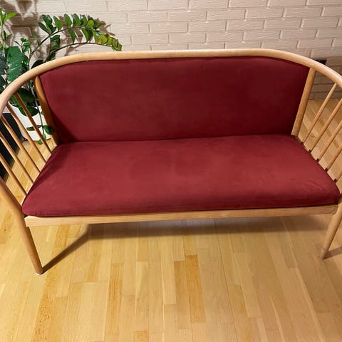 Sofa med træramme og grå polstring, designet til to personer. Sofaen har en solid træstruktur med lodrette ryglænssprosser og gråt betræk på sæde- og rygpuder. Egnet til brug i stue eller kontor.