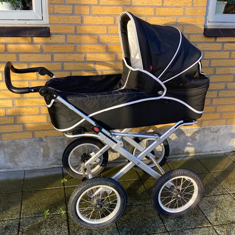 Odder barnevogn med sort stel og grå stof. Barnevognen har en robust ramme og store hjul, der sikrer stabilitet og nem håndtering.