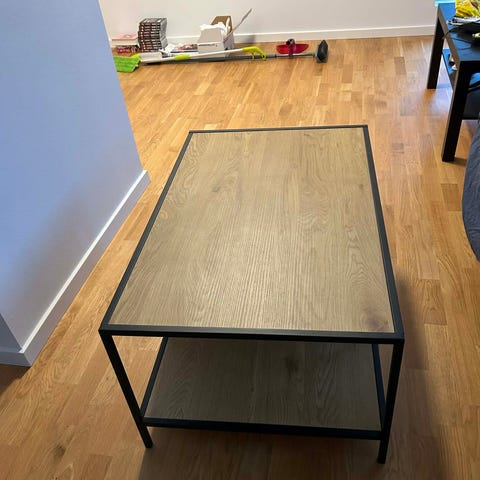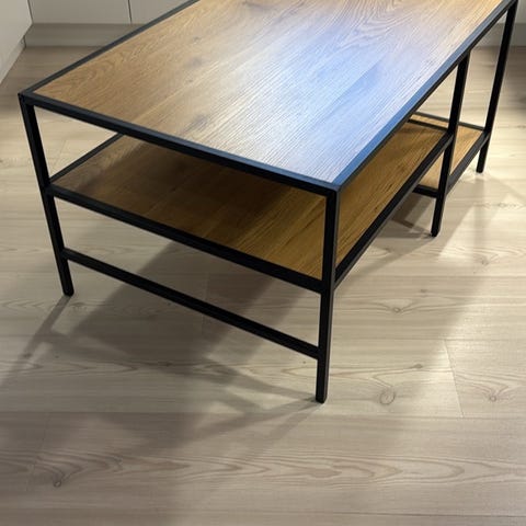 Flot og moderne sofabord med bordplade i trælook og sort metalstel. Bordet har et let og stilrent udtryk og passer perfekt ind i en nordisk eller moderne indretning.