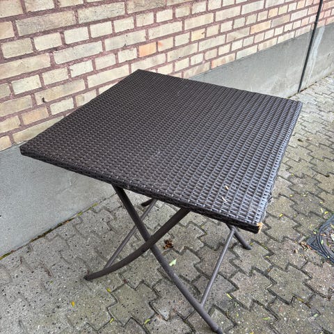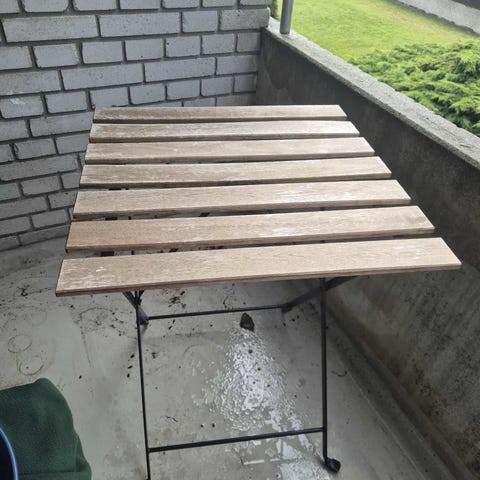 Foldbart balkonbord med bordplade i træ og ramme i metal. Designet til at kunne foldes op og ned for at spare plads på balkonen. Velegnet til små udendørsarealer, hvor pladsoptimering er ønsket.