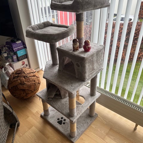 Grå katteklatrestativ med huler og stige