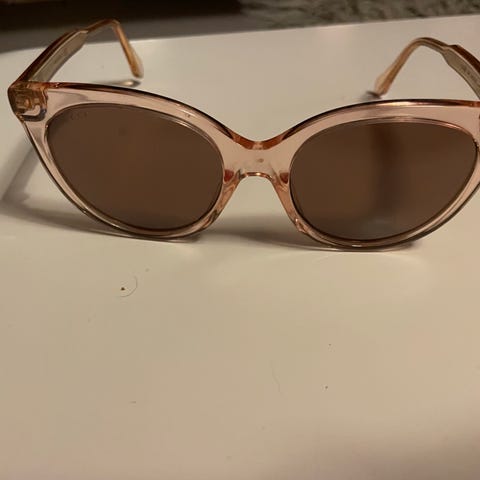 Gucci solbriller til kvinde med brune stel og brune linser. Solbrillerne har et design med synligt Gucci-logo på siderne og medfølgende sort etui.