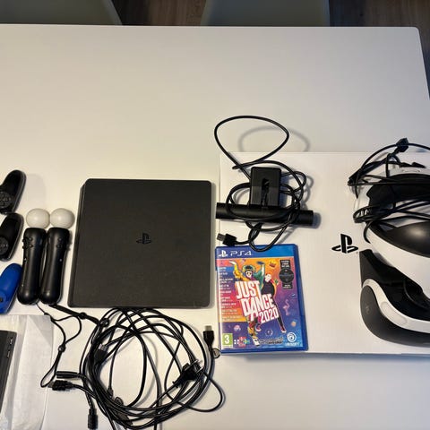 Playstation 4 VR Headset med tilhørende controllere og diverse kabler. Sættet inkluderer VR-briller, bevægelsessensorer, to controllere og forbindelseskabler til brug med Playstation 4 konsol. Mangler vist oplader kabel, men et mikro usb kabel fungere til alle kontroller, ene kontrollere har mindre skade men funger perfekt.