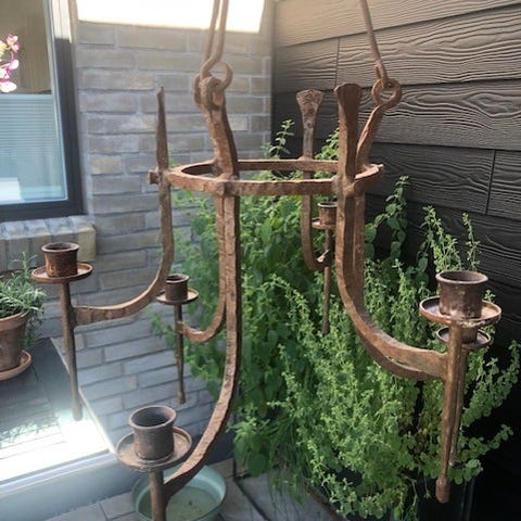 Til 10 stk. lys, fyrfadslys eller olielamper. Diameter på lampen ca. 60 cm. Højde ca. 60 cm. Der medfølger 3 stk. kroge til at justere højden. Krogene er ca. 20 cm lange. Kom med et bud hvis du er interesseret så finder vi en god og fair pris. Jeg har 6 stk. olielamper der kan følge med + glasskåle til fyrfadslys.