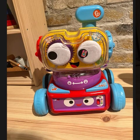 Fisher-Price legetøjsrobot med farverige detaljer og bevægelige dele. Designet til børn og fremmer leg og læring gennem interaktive funktioner.
