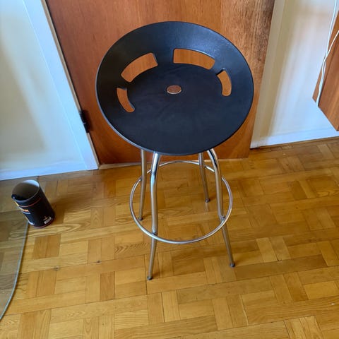 Flot forkromet barstol med justerbar højde (gasfjeder). God siddekomfort. Fejler intet bortset fra, at betrækket er i stykker, men det kan du sikkert nemt skifte selv, hvis du er lidt "fingernem".