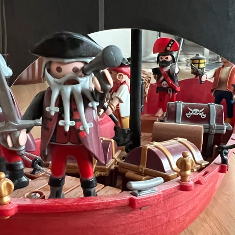 Ekstra piratflag medfølger. Andre småting som en kurv på masten etc mangler.