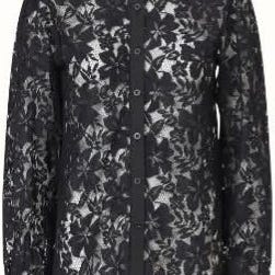 Sort skjorte i polyester til kvinder i størrelse XL. Skjorten har lange ærmer og knaplukning foran. Materialet er let gennemsigtigt med mønsterdetaljer.