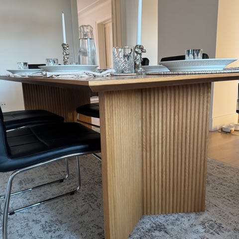 Bordpladen og bordben er massiv egetræ. Bordpladen er afstivet med egetræsafstiver.