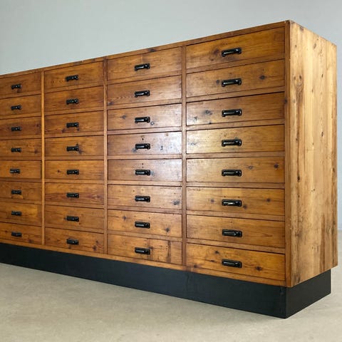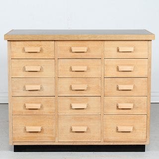 disk med glasplade. Skabet har flere skuffer og rum til opbevaring samt en glasplade på toppen. Fremstillet i træ med naturlig overflade formodentlig eg