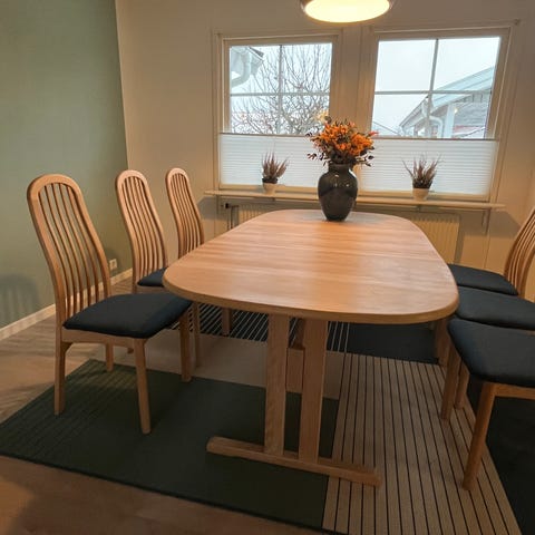 Ny pris 1700 kr Bord med 6 stole Ø/B 110 cm / L. 150 cm