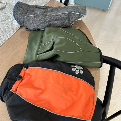 Brugte hunde jakker ( regn og vinter). I god stand. De røde jakker er hurtta
