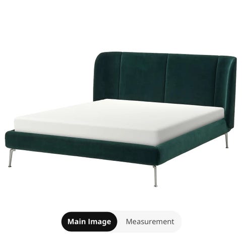 IKEA seng med lamelbund og madras i grå farve. Sengen har en polstret ramme og hovedgærde, lamelbunden består af trælameller, og madrassen er med en quiltet overflade. Sengen er velegnet til soveværelse og tilbyder støtte og komfort.
