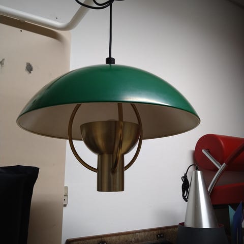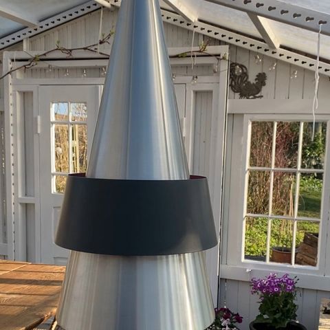 Jo Hammerborg, pendel model Central. af hvid og grålakeret metal. Formgivet 1967 Fremstillet hos Fog & Mørup, H. 32, Ø. 23 cm.