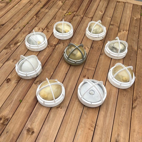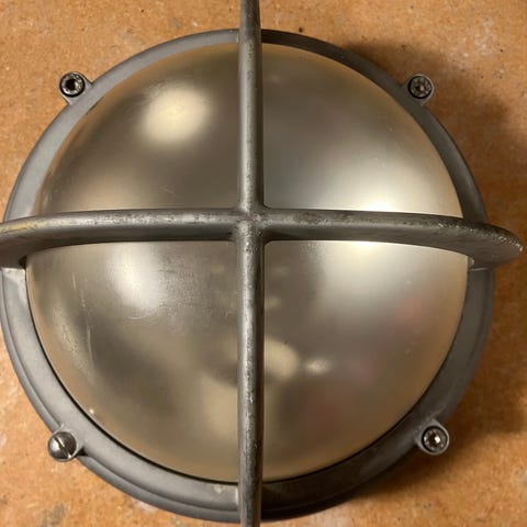 LK 118AA200 sølv/koksgrå Skotlampe i støbt aluminium, så ingen rust. Diameter er 24 cm. Få mindre brugsspor. Med hvid reflektorskærm og porcelænsfatning til alm. elpære med stor fatning. Har 2 stk og prisen er pr stk.