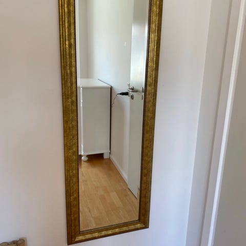 IKEA spejl med dekorativ gylden ramme. Spejlet har en unik form med buede og lige kanter, hvilket giver det et klassisk og elegant udseende. Velegnet til ophængning i forskellige rum for at tilføje funktionalitet og stil.