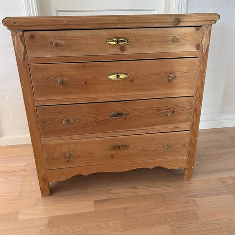Smuk afsyret fyrretræs kommode med 4 skuffer og kuglefødder sælges på grund af flytning.