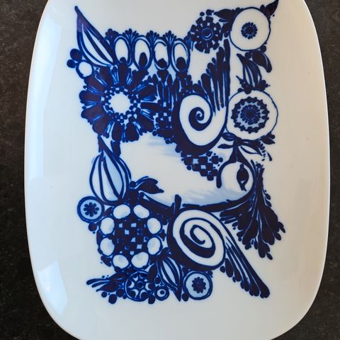 Bjørn winblad/ Rosenthal Studio-line dekorationsfad med blå og hvide mønstre. Fadet har et dekorativt design med en fugl, blomster- og bladmotiv Materialet er porcelæn.