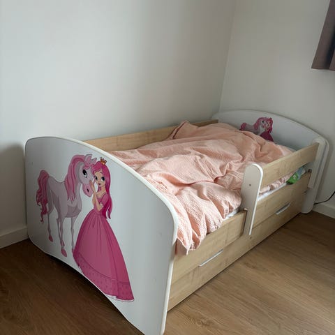 Sengen har runde kanter så børnene ikke slår sig og der følger et bevægeligt sikkerhedsrækværk med.