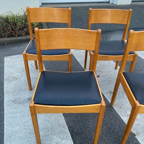 4 spisebordstole fra 70er udført i fyrretræ nyompolstret i langhåret lammeskind