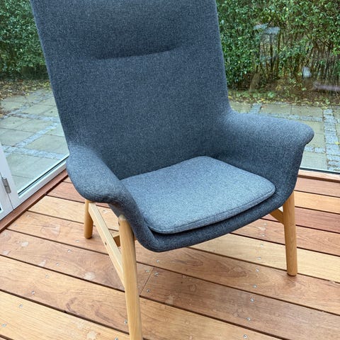 Fin grå betrukket lænestol med lidt brugsspor på benene som set på billederne, ellers i rigtig flot stand