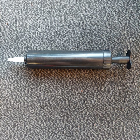 En lille boldpumpe til sportsbolde. Pumpen har nåleventil og er 20 cm lang.