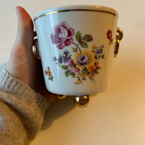 Retro dekorationskrukke med blomsterdekor og gulddetaljer. Det er Østtysk porcelæn fra mærket 'Metzler & Ortloff, Ilmenau (GDR / DDR)'. Den måler 11 cm i højden og 11 cm i diameter. Krukken er lavet af porcelæn og har tre guldfarvede fødder samt guldfarvede ringe som håndtag. Den har en hvid base med farverige blomsterprint.