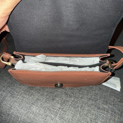 DAY ET Læder taske til unisex. Tasken er lavet af læder og har en lys ydre farve med en gul inderside. Den har en lynlåslomme på forsiden og justerbar rem.