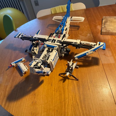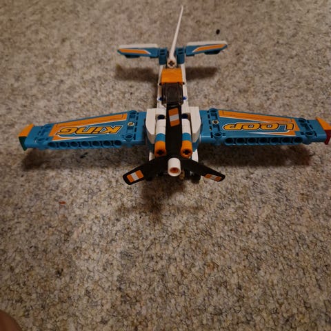 LEGO Technic flymodel med detaljeret design og funktioner. Modellen er sammensat af LEGO-klodser i forskellige farver, primært blå, hvid og sort. Flymodellen inkluderer bevægelige dele som vinger og propeller, og repræsenterer et teknisk avanceret legetøj til børn og samlere.