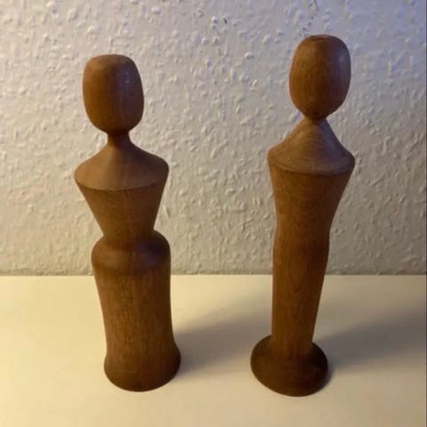 To håndskårne træskulpturer, der forestiller en mand og en kvinde. Skulpturerne er lavet af mørkt træ og har detaljeret udskæring, der viser traditionelle beklædningsgenstande og kropsholdninger.
