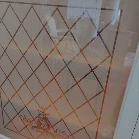 Vitrineskab med 6 små ruder i overskab og 3 hylder. Lampe monteret i toppen.