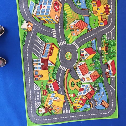 IKEA børnetæppe med motiv af veje, bygninger og grønne områder. Designet til børneværelser og legemiljøer, med farver og mønstre, der illustrerer en byscene.