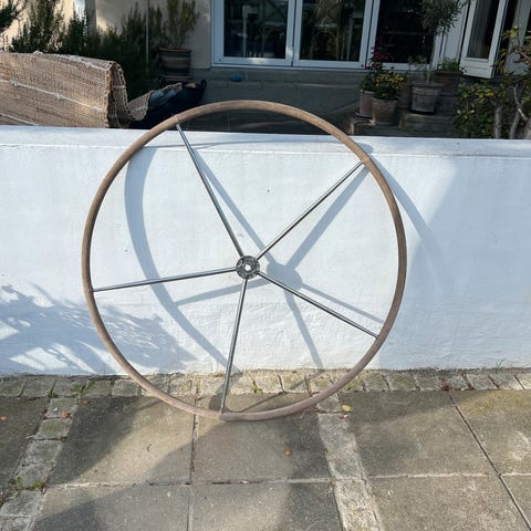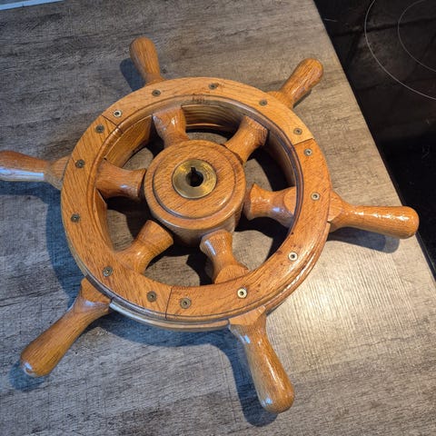 Skibsrat fremstillet i træ med messingdetaljer, inkluderer indbygget kompas. Ratets design omfatter flere håndtag og en solid konstruktion, egnet til maritime formål eller som dekorativt element.