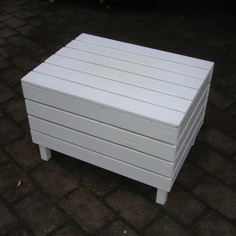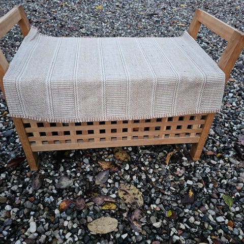 Opbevaringsbænk i træ med hvidmalet overflade og tre fletkurve til opbevaring. Bænken har en flad top, der kan bruges til siddeplads eller opbevaring, og kurvene er lavet af flettet materiale med stofbetræk og bindebånd. Farve: hvid og naturfarvet flet.