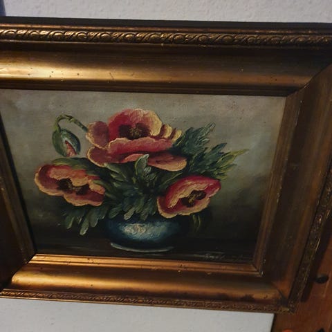 Maleri af kvinde med blomster i ramme fra begyndelsen af 1800-tallet