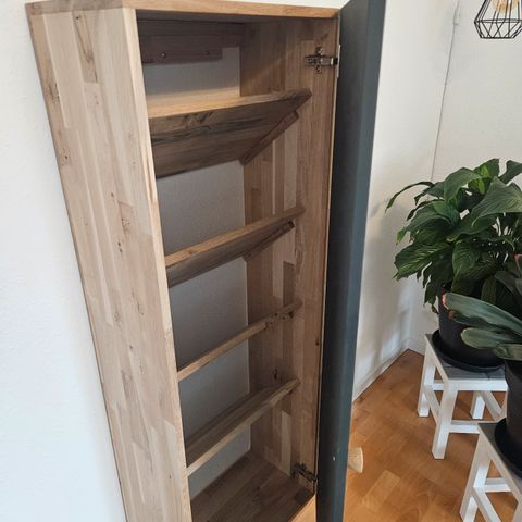 Stilfuld skoskab i massiv egetræ, med easy lock hængsler, skrå eller lige hylder på egetræs ben foran, bagved støtter den på panelet samt ophæng. Som set på billedet, i hvid, kan males i andre farver.
