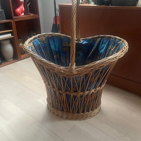 Skøn stor og massiv kurv i flet (67 cm høj, 51 cm bred, 46 cm dyb, med lidt smallere bredde og dybde i bunden) til vasketøj, udklædningstøj eller hvad som helst.